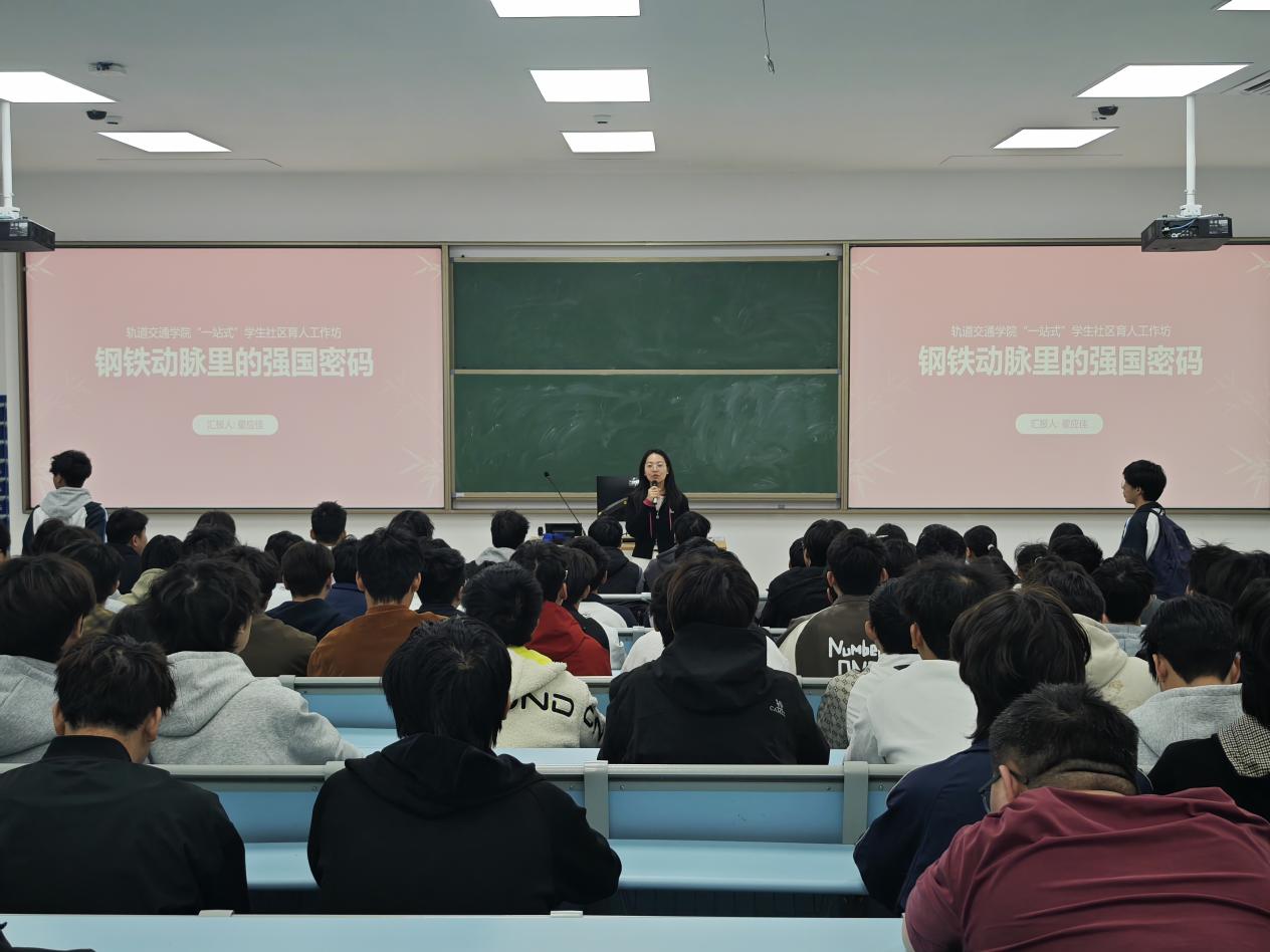 交通强国路,青春勇担当。为深入贯彻党的二十届四中全会“统筹教育强国、科技强国、人才强国建设”的战略部署,2025年11月20日,轨道交通学院在清远校区“一站式”学生社区开展主题育人工作坊,本次讲座的主讲人是轨道交通学院直属党支部党建组织员翟应佳,她以“钢铁动脉里的强国密码”为核心,为轨道学子解读行业发展趋势、明晰成长路径,引导青年将个人理想融入中国式现代化建设大局。