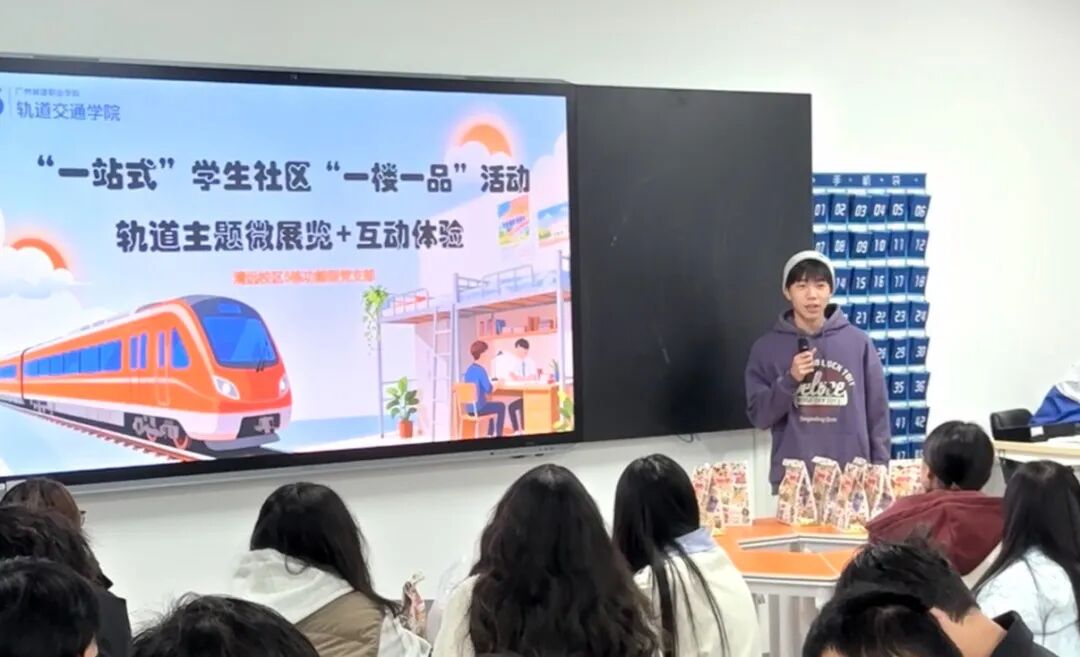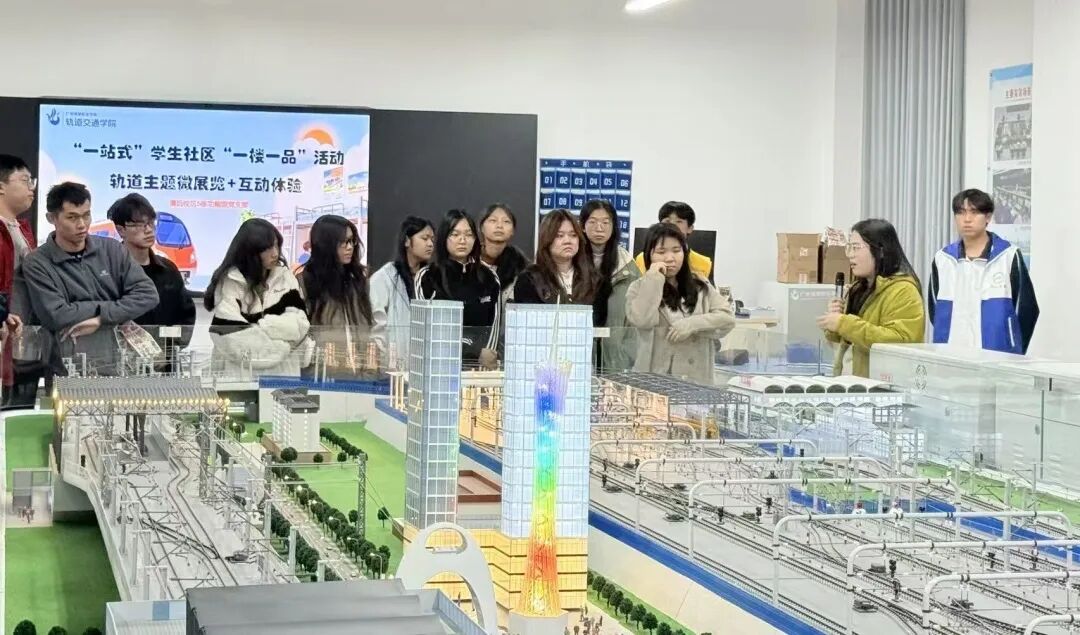 2025 年 11 月 27 日下午 16:30,清远校区5号学生公寓一站式学生社区“一楼一品”系列活动之轨道交通主题微展览暨互动体验活动如期举行。活动以沉浸式展览、专业讲解与互动体验相结合的形式,让参与活动的各学院的同学近距离感受轨道交通的科技魅力与发展脉搏,实现知识性与趣味性的深度融合。