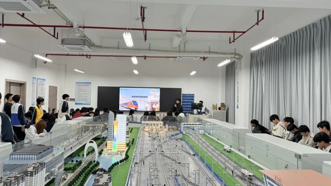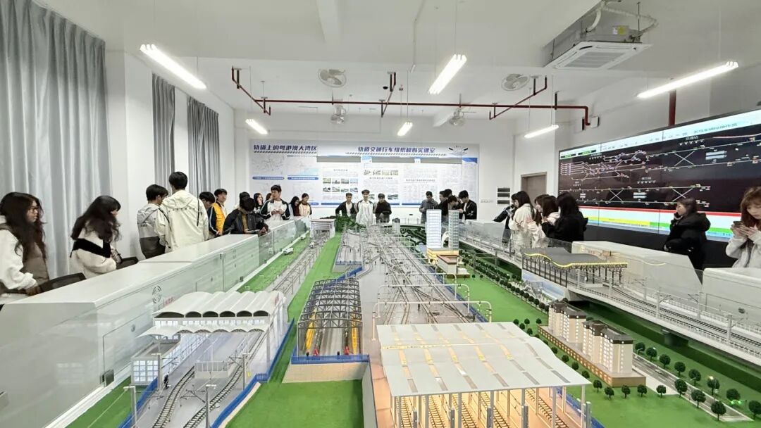 活动伊始,同学们率先参观了轨道交通行车组织模拟实训室。现场的行车模拟设备、信号控制系统及运营流程图文展板,直观呈现了轨道交通行车组织的核心逻辑,模拟调度台、线路运营沙盘等装置吸引大家驻足操作,同学们在实践与观察中,初步构建起对轨道交通行车组织的清晰认知。